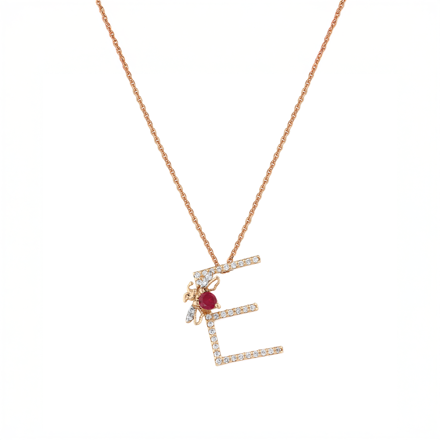 LETTER E GOLD DIAMOND RUBY SMALL NECKLACE